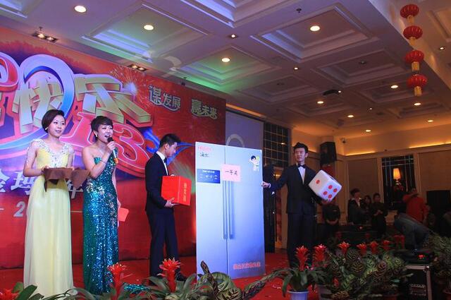 除了一出出精彩絕倫的文藝演出外,年會(huì)當(dāng)中還穿插了一些激動(dòng)人心的抽獎(jiǎng)環(huán)節(jié),吊足了現(xiàn)場(chǎng)人員的胃口。幸運(yùn)獎(jiǎng)、三等獎(jiǎng)、二等獎(jiǎng)、一等獎(jiǎng)的抽獎(jiǎng)環(huán)節(jié),不斷將年會(huì)掀起高潮。最后,公司員工夏雷以超好的手氣在擲骰子過(guò)程中獲得最大點(diǎn)數(shù),贏得了一等獎(jiǎng),幸運(yùn)獲得海爾雙開門電冰箱一臺(tái)。